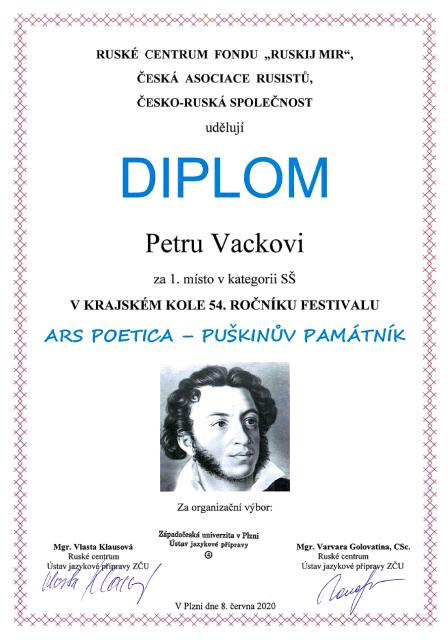Naši školu velice úspěšně reprezentoval student III.A Petr Vacek, který v soutěži zvítězil a umístil se na krásném 1. místě.