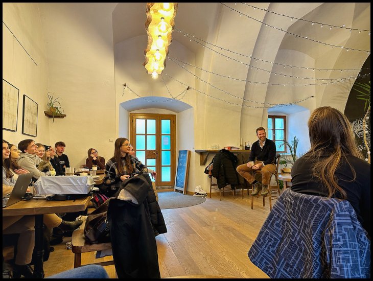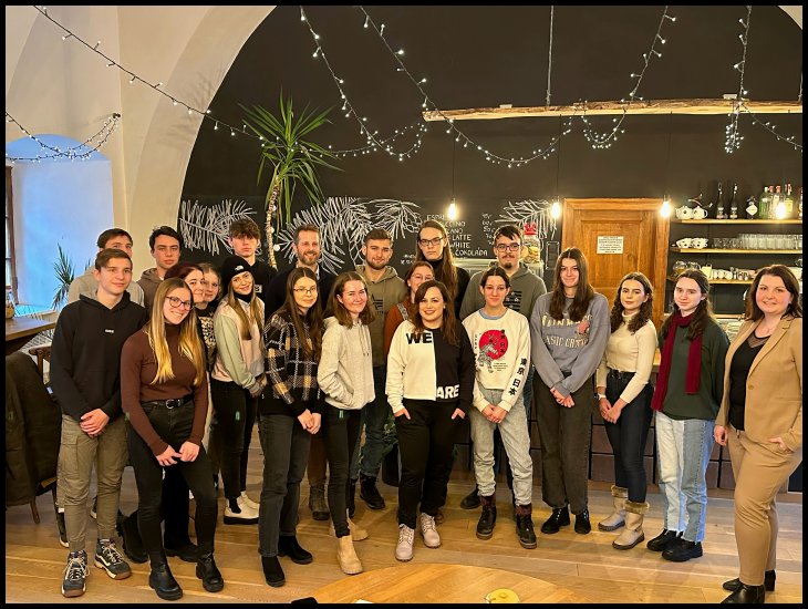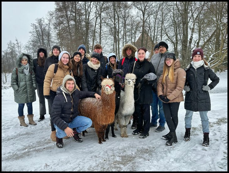 Dne 14. prosince se třída 5.E vypravila na exkurzi na zámek v Blatné. Součástí programu byla komentovaná prohlídka budovy, bruslení na umělé ploše v areálu zámku a především beseda s majitelem v anglickém jazyce. Dozvěděli jsme se například, co obnáší správa podobné instituce a kde všude mohou dnes mladí lidé uplatnit znalost jazyků. Velký úspěch měla také poslední aktivita – procházka s lamami, které na místě chovají. Skvělá nálada a čerstvě napadaný sníh dodaly výletu dokonalou předvánoční atmosféru.