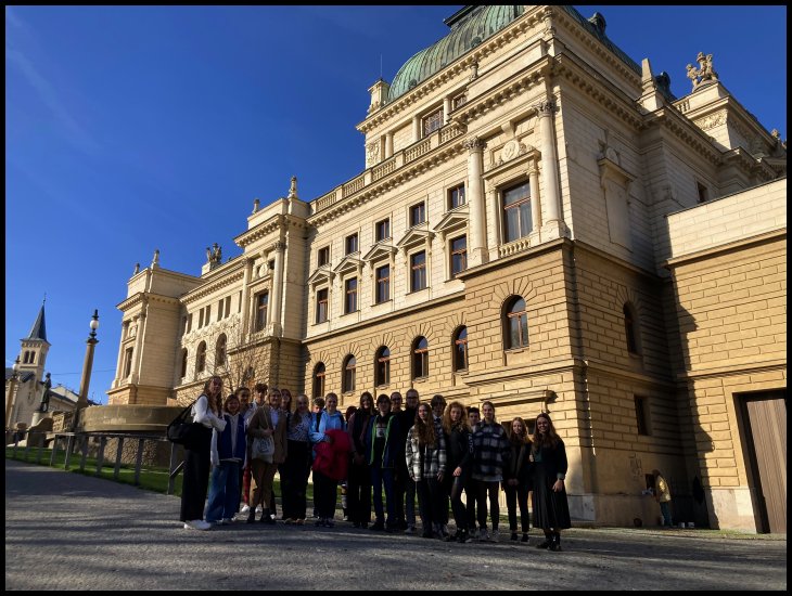 V pondělí 31. října třída 3.E navštívila historickou budovu Velkého divadla. Prohlídka trvala něco málo přes hodinu a prohlídli jsme si nejen volně přístupné prostory jako hlediště a foyer, ale dostali jsme se i na jeviště, do zázemí šaten či do suterénu, kde se skladuje část kulis. Dozvěděli jsme se, kdo byl první ředitel divadla, kolik zaměstnanců v divadle pracuje, kolik diváků divadlo pojme, k čemu slouží ferman, kde je ukrytý plán stavby a rekonstrukce divadla, kde je pavouček pro štěstí a mnoho dalších zajímavostí.