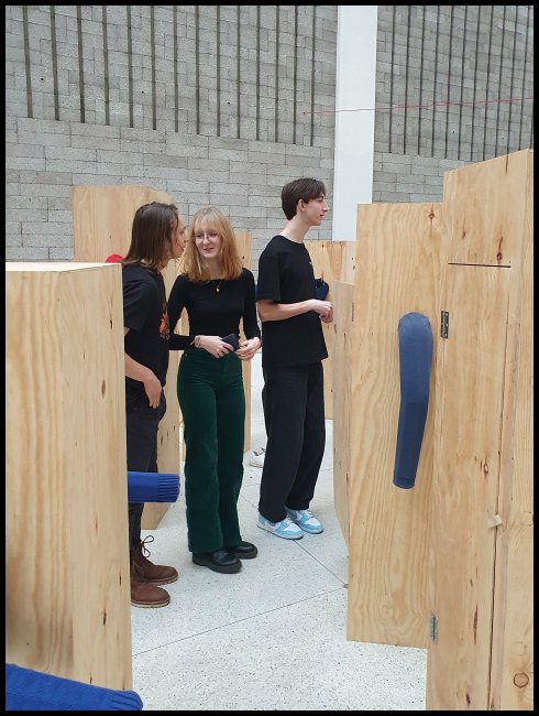 Ve čtvrtek 9. března naše třída v rámci výtvarné výchovy navštívila v Praze dvě výstavy. Jako první jsme jeli do Veletržního paláce na výstavu Moje tělo není ostrov od Evy Koťátkové, která poukazuje na to, jak hluboce jsou naše osobní životy ovlivněny sociálním prostředím, v němž žijeme, jeho kódy a normami. Tento vliv je demonstrován složitými mašinériemi, které omezují tělo, ale také nabízejí možnosti jeho proměny. Tato výstava rozhodně nebyla jednoduchá na pochopení a i ostřílení návštěvníci, kteří se nebojí žádné metafory a žádného skrytého významu, by mohli mít problém se v ní vyznat. A tak my, bez mapy, slepí, jsme se v tomto bludišti nechali za ručku vést místní průvodkyní, díky které jsme dostali příležitost se vskutku hluboce ponořit do možností, jež výstava nabízela. V malých skupinách jsme si vyzkoušeli různé úkoly, například vymyslet nějakou performanci, a doslova jsme se díky tomu stali součástí expozice. Přesvědčili jsme se, že v galerii se nemusíme jen dívat na umělecká díla, ale že se dá výstava prožít, že se tam může ležet, lézt do objektů, dokonce i záměrně křičet...