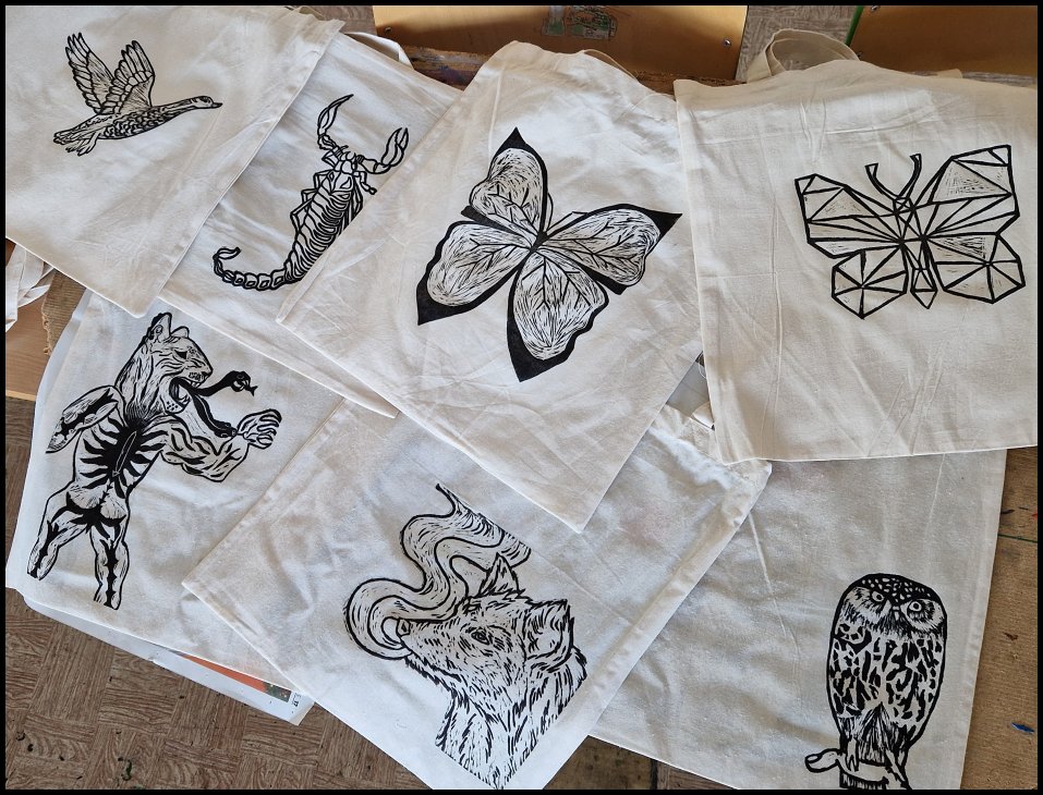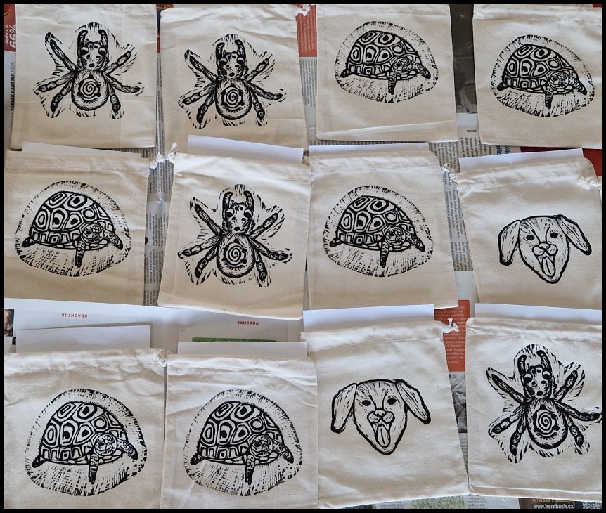 V prosinci 2023 studenti výtvarného oboru zužitkovali své linoryty k potisku tašek. Prodanými taškami na půdě školy jsme získali krásných 5770,-Kč, které jsme se rozhodli věnovat Psímu útulku v Plzni.