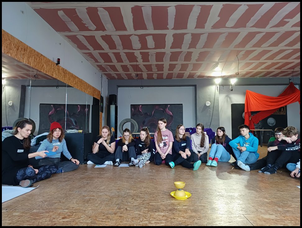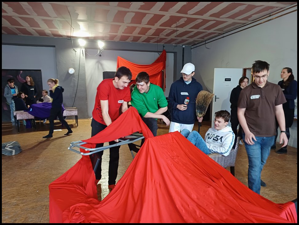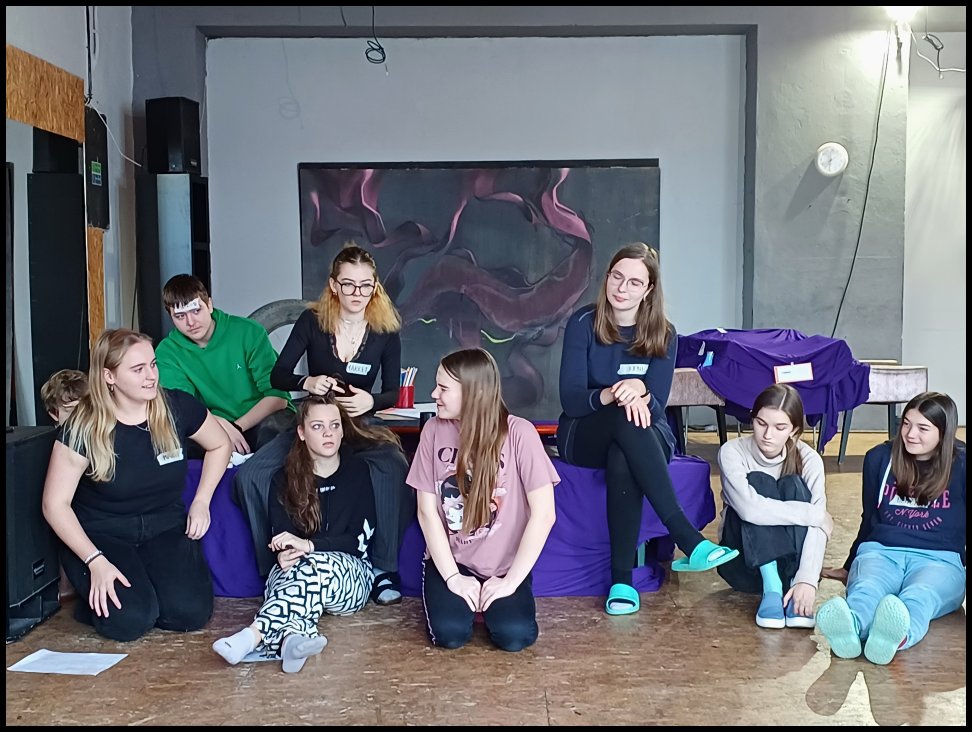 V pátek už bylo na nás, jak se popereme s tvorbou našeho vlastního představení. Třída se rozdělila do čtyř skupin a každá se věnovala jiné umělecké aktivitě se svými lektory. Hudební skupina vytvořila hudební podkres pro celé představení, pohybová se věnovala choreografii, výtvarná měla za úkol vytvořit pozadí a celé představení bylo doprovázeno texty skupiny slam poetry. Odpoledne jsme pak naše společné dílo předvedli divákům ze septimy.