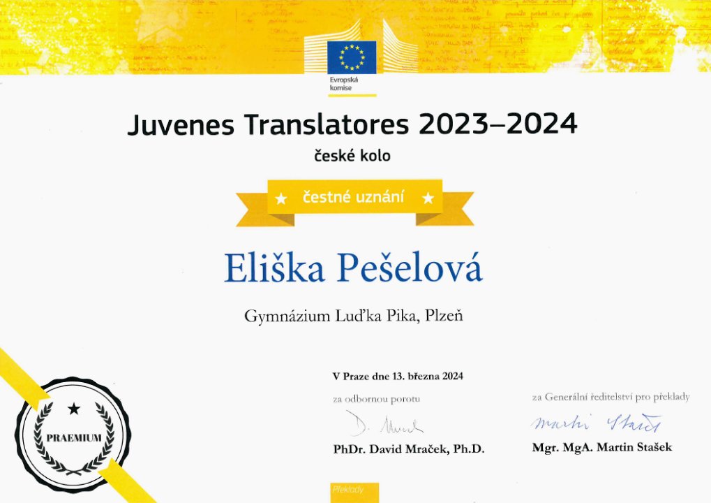 Ve středu 13. března byly online vyhlášeny výsledky českého kola překladatelské soutěže Juvenes Translatores. Čestné uznání získala Eliška Pešelová z 6.E za svůj vynikající překlad textu ze španělštiny do češtiny a obdržela od Zastoupení Evropské komise v ČR hodnotné ceny. Gratulujeme.