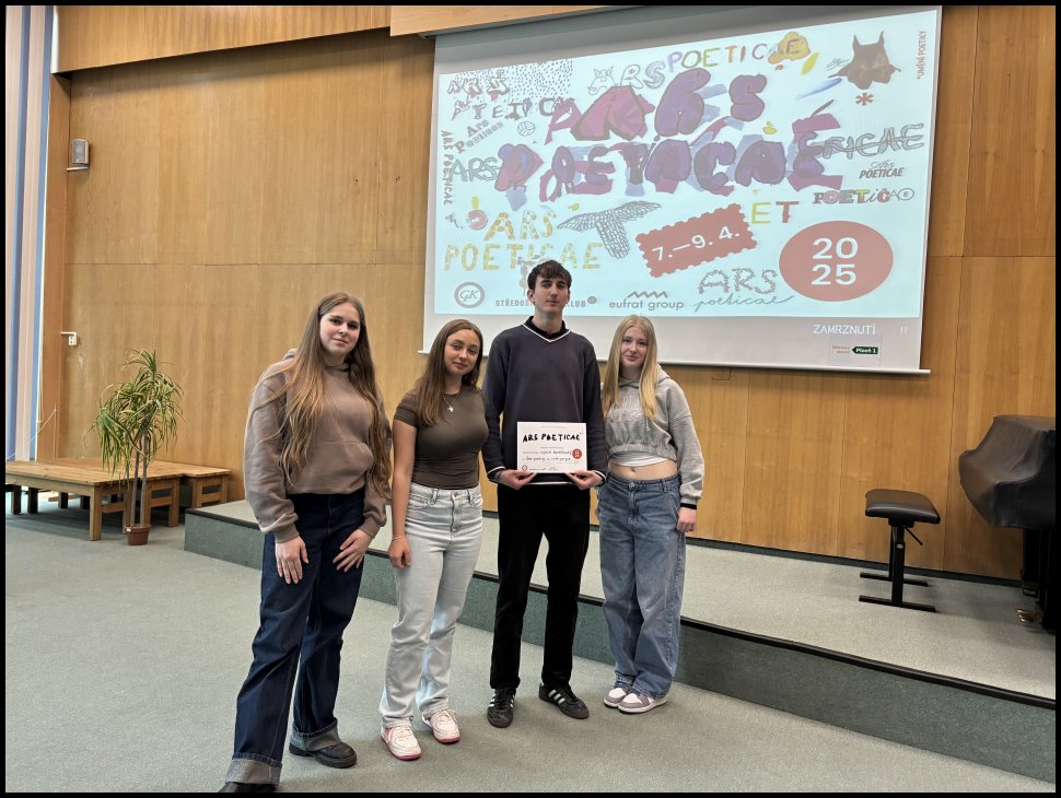 Dne 7. dubna jsme se společně s Vojtou (7.L) , Sárou (2.E) a Zuzkou (1.E) zúčastnili 22. ročníku soutěže Ars Poeticae, která se konala v aule Gymnázia Františka Křižíka. Naši školu jsme reprezentovali ve třech kategoriích – v přednesu, slam poetry a v překladu.
