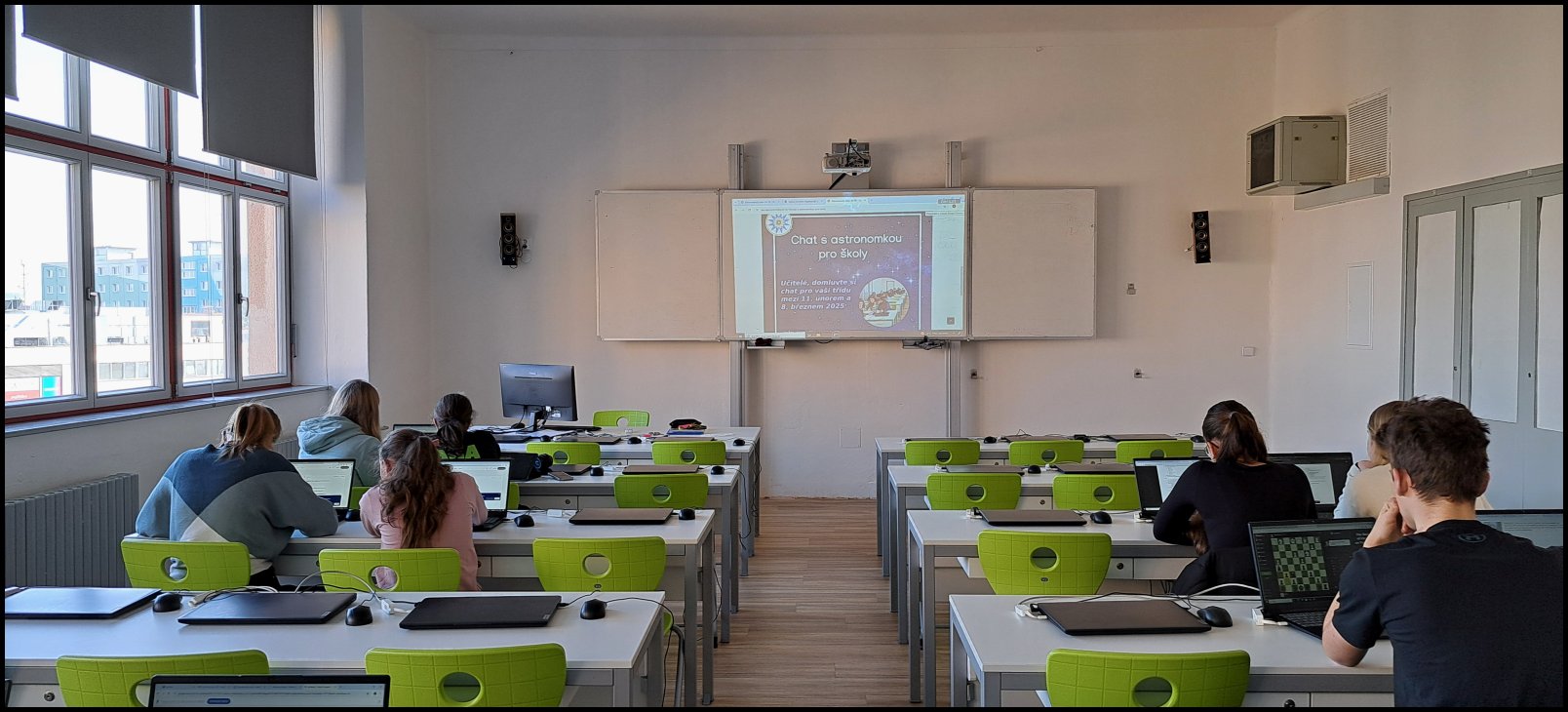 Dne 21. a 24. února jsme měli domluvenou skvělou zkušenost - chat s astronomkou. Na začátku hodiny byla naše třída rozdělena do dvojic nebo trojic, každá skupina byla přiřazena k jedné ze tří astronomek. Společně jsme spolu konverzovali a měli jsme příležitost se jich ptát na otázky o vesmíru, zálibách a dokonce i o jejich profesi. Poslaly nám fotky, videa a jejich výzkumy. Myslíme si, že je to skvělá zkušenost konverzovat ve španělštině a dozvědět se zajímavé informace o vesmíru.