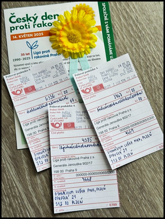 Naše škola se letos zapojila velmi aktivně – nejen prostřednictvím štědrých příspěvků zaměstnanců a žáků, ale i díky přímé dobrovolnické účasti dvou z nich. Barbora Ch. a Natálie K. z 5.M se s kytičkami vydaly do ulic a společnými silami se nám podařilo vybrat částku v celkové výši 15 853 Kč. Ta vznikla díky kombinaci tradičního darování v hotovosti a moderních plateb přes QR kódy, které byly přičteny dodatečně.
