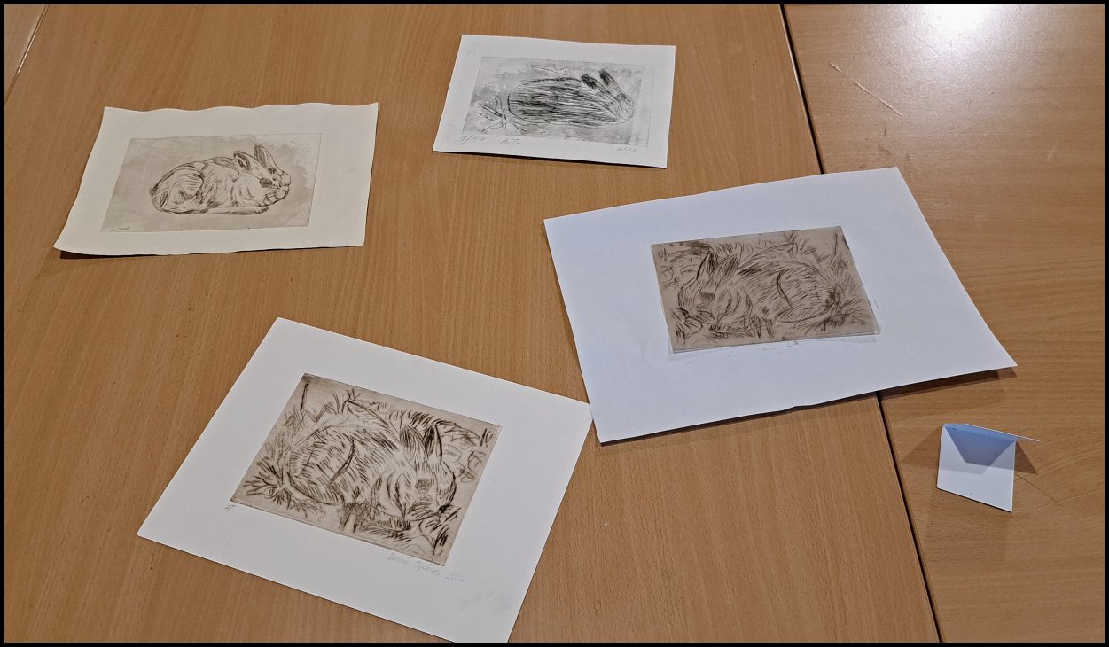Poté následovala část praktická, kde jsme se přesunuli do dílny. Všichni jsme si vyryli obrázek králíka na fólii, pokryli jsme ho tenkou vrstvou barvy a obtiskli jsme ho na navlhčený papír pomocí lisu. Po skončení prohlídky jsme navštívili Vánoční trhy na Staroměstském náměstí, odkud jsme se potom vydali na nádraží Smíchov a zpět do Plzně.