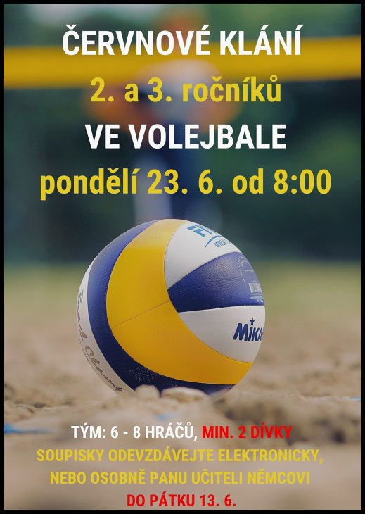 A teď to hlavní! Turnaj se odehraje v pondělí 23. června od 8:00 na venkovním hřišti naší školy. Při nepřízni počasí uvnitř v tělocvičně.