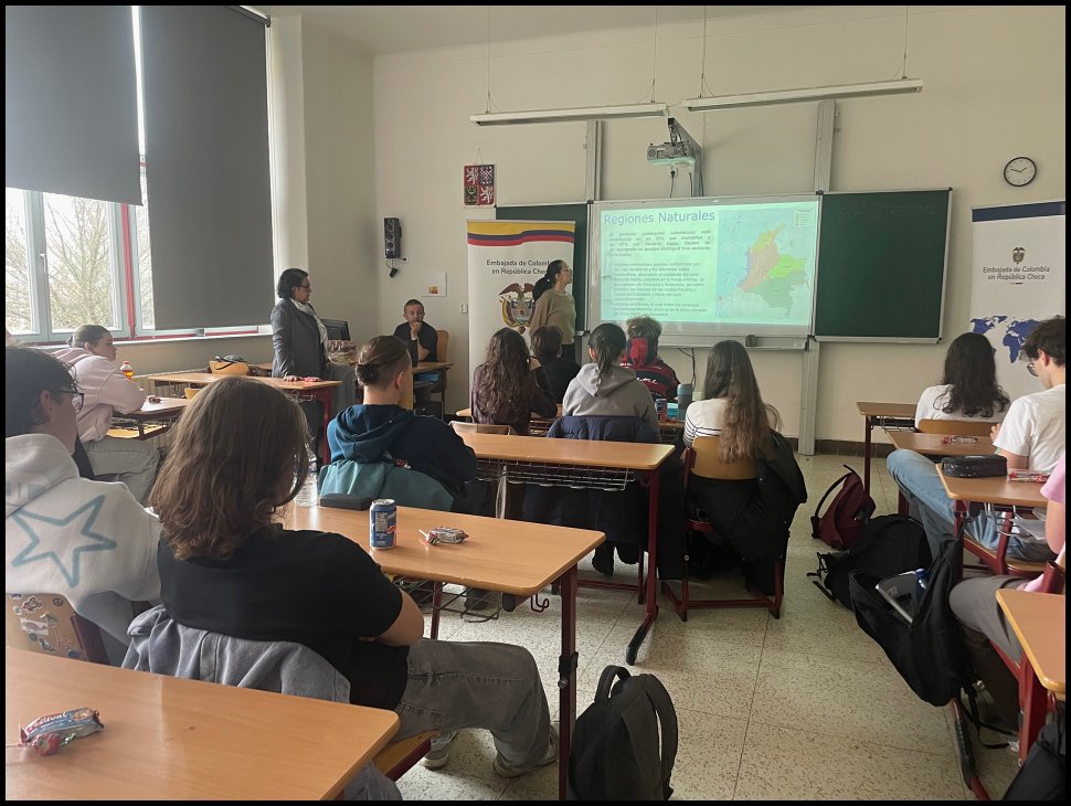 Dne 17. února nás navštívilo kolumbijské velvyslanectví a přednášku vedla Solangel Ortiz. Během prezentace jsme se dozvěděli mnoho zajímavých informací o Kolumbii. Přibližně třetinu jejího území tvoří hory sahající až do výšky 4 000 metrů nad mořem. Představen byl kondor andský jako národní symbol, dále bohatství na smaragdy a skutečnost, že Kolumbie patří mezi státy s největšími zásobami sladké vody. Dozvěděli jsme se také o mimořádné biodiverzitě, zejména obojživelníků, a o tom, že zde rostliny rostou dvakrát až čtyřikrát rychleji než v ostatních státech. Součástí programu byly informace o obyvatelstvu (převážně míšenci a běloši, asi 4 % tvoří původní obyvatelé), o vyhlášené jemné kávě, karnevalu v Barranquille, Květinovém festivalu v Medellínu a organizaci Humanimal Tourism.