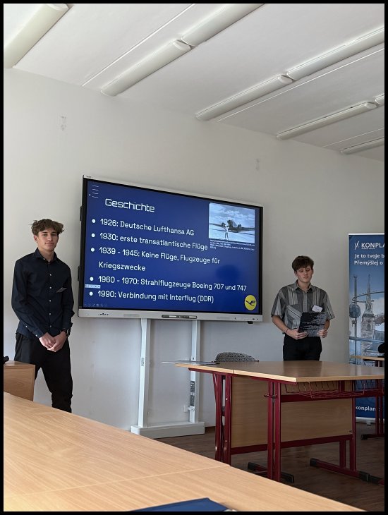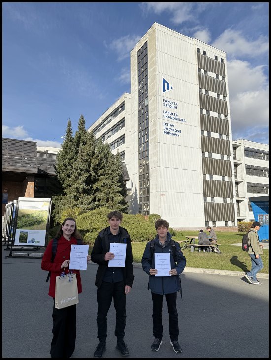 V úterý 4. listopadu 2025 jsme měli tu možnost zúčastnit se prestižní soutěže na Ústavu jazykové přípravy Západočeské univerzity v Plzni. Jednalo se o studentskou konferenci, na které jsme mohli ukázat své znalosti cizích jazyků. Západočeská univerzita nabídla studentům účast v několika jazykových sekcích – anglické, španělské, francouzské, ruské a německé. My jsme si vybrali právě němčinu. Celá konference spočívala v tom, že si každý účastník připravil prezentaci na zvolené téma a svůj příspěvek poté představil před odbornou komisí. V sekci německého jazyka zasedla komise složená z vyučujících ze ZČU, paní doktorky z partnerské univerzity ve Weidenu a zástupkyně německé firmy KONPLAN. Do německé sekce se přihlásilo celkem 13 studentů – jak z vysokých, tak i ze středních škol. Naši školu reprezentovali Matěj Červeň a Martin Petrášek (7.L) a Barbora Šiková (4.A), která byla nakonec oceněna firmou KONPLAN za 2. místo v kategorii SŠ. Matěj s Martinem vystoupili s tématem Lufthansa a Bára se věnovala jazykovědnému exkurzu do tajů bavorštiny. Moc děkujeme za tuto skvělou zkušenost!