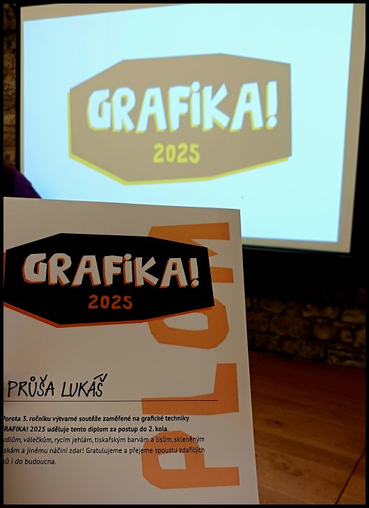 V neděli 19. října se v Praze uskutečnilo slavnostní vyhlášení vítězných prací 3. ročníku Grafika. SVČ Jednička Praha do soutěže přijala zhruba 1 120 grafických listů. Do výběru 140 nejlepších, tedy do desetiny vystavených prací a do druhého kola se dostala práce našeho studenta ze 4.L.