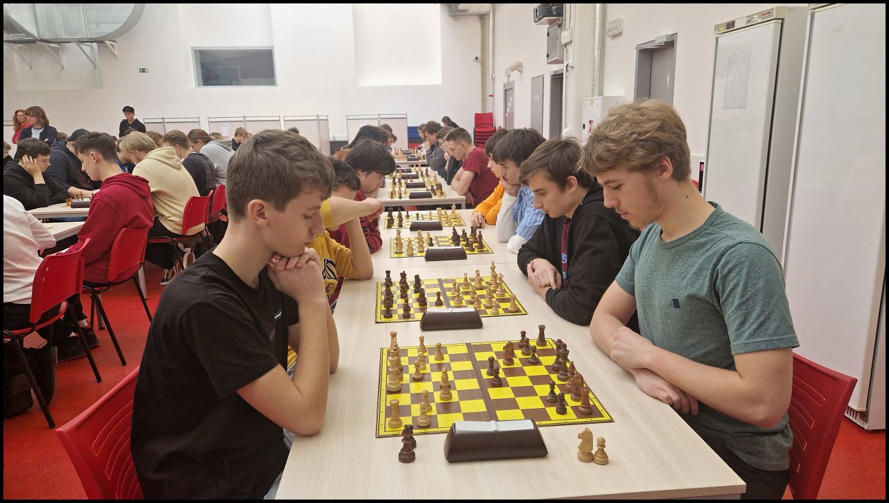 V pondělí 10. listopadu se v Techmánii konal Okresní přebor škol v šachu. Tempo hry 15 minut bylo často v koncovce dramatické a hráči lámali rekordy v rychlosti mačkání hodin ve zlomcích vteřiny... Do poslední chvíle i vývoj celého turnaje byl pro naše týmy velmi napínavý. Čtvrtý nasazený tým A ve složení: Tomáš Zelenka, Jakub Kešner, Vojtěch Jančík a Michal Heřman vybojovali krásné 3. místo a stříbro jim uniklo s nejmenším možným rozdílem-pouze o pomocné hodnocení PH2. Porazili dokonce 3. nasazené Masarykovo gymnázium. Navíc primán Tomáš Zelenka byl nejmladší hráč na 1. šachovnici a zřejmě i v celé kategorii středních škol. První dva týmy postupují do krajského kola, ale my pevně věříme, že by naše družstvo A mohlo získat divokou kartu a tím šanci utkat se ještě v Krajském přeboru o postup na Mistrovství České republiky, které se každoročně koná ve Zlíně na konci června.