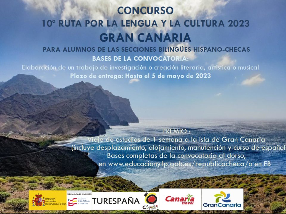 Španělské velvyslanectví vyhlašuje 10. ročník soutěže o Gran Canarii pro studenty bilingvní sekce. Termín odevzdání literární práce v rozsahu max. 10 stran nebo uměleckého díla je 5. května 2023. (více)