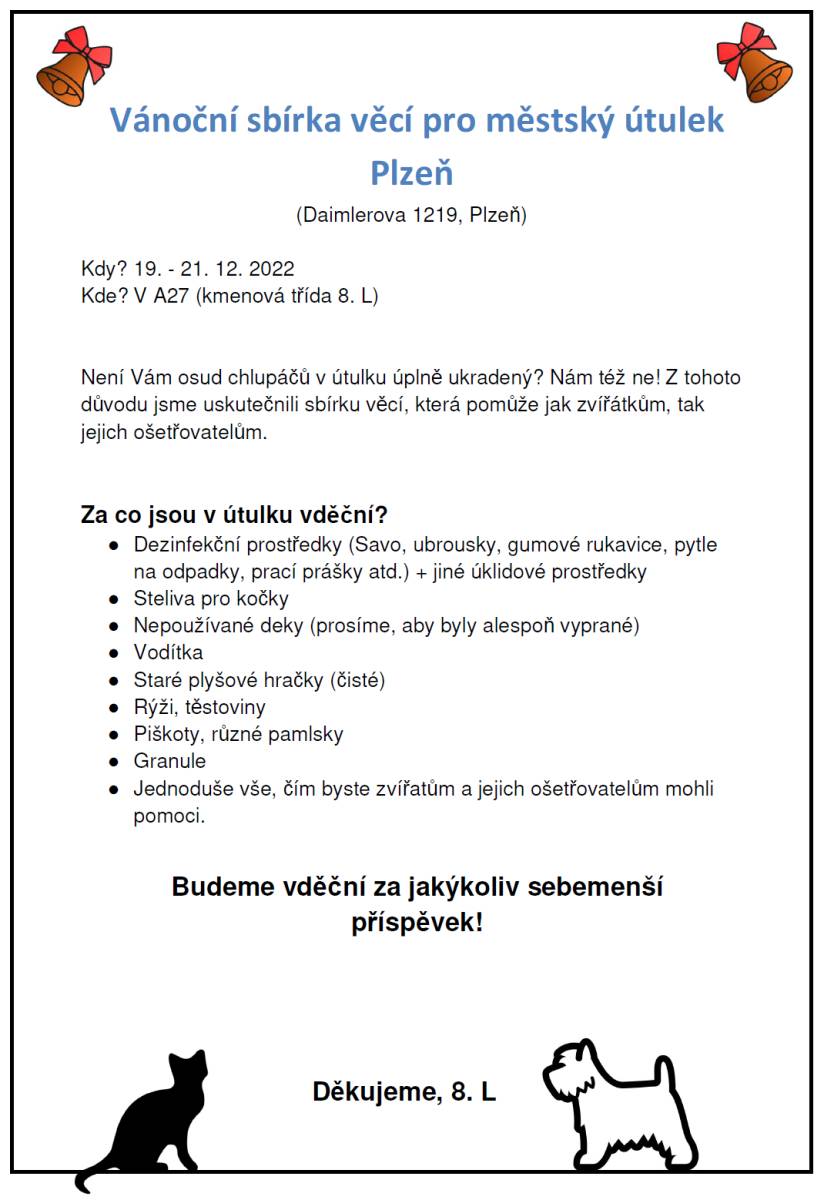 V pondělí 26. září 2022 se naše škola jako každý rok zúčastnila akce Evropský den jazyků, který pořádá Studijní a vědecká knihovna Plzeňského kraje. Třída 2.L se na prvním stanovišti Amerického centra Plzeň dozvěděla, jaké jsou možnosti studia v USA, jaké kroky je třeba vzhledem k jejich věku podniknout a jaké jsou jiné alternativy... (více)