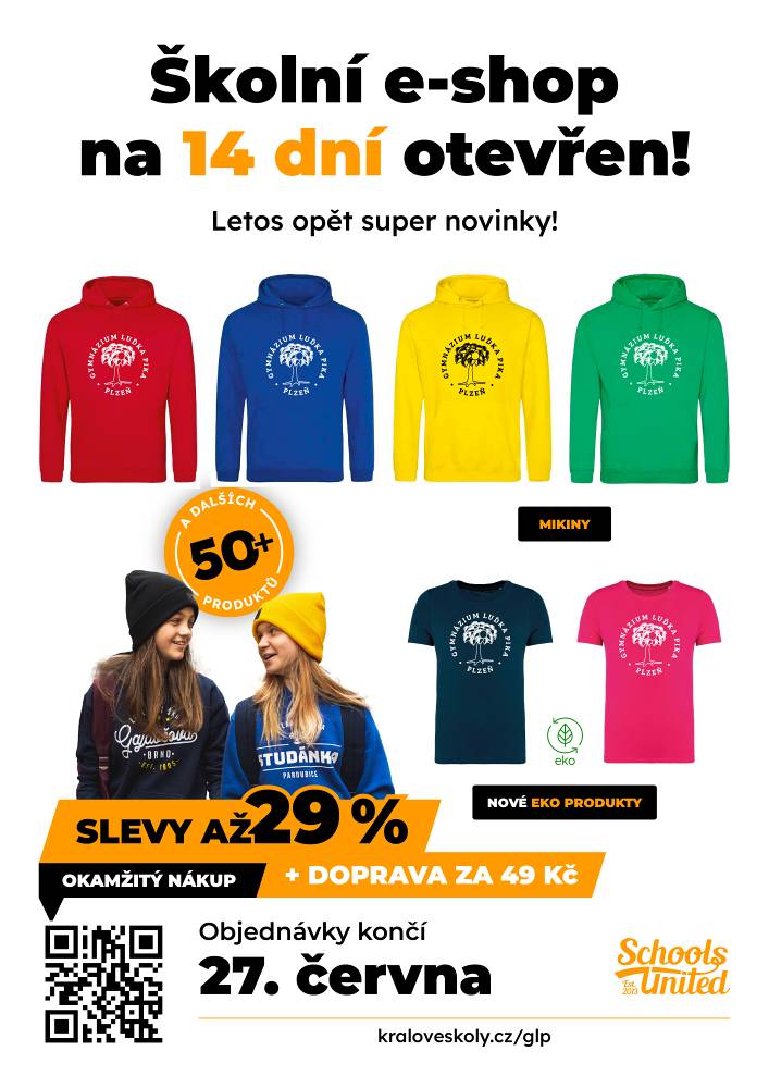 Schools United s.r.o. vytvořila volnočasovou školní kolekci oblečení, jejíž náhled uvidíte po rozkliknutí obrázku a kterou je možné si aktuálně pořídit na e-shopu. Objednávání je již spuštěno a bude možné až do 27. června 2024. Tento den se e-shop uzavře, objednané zboží půjde do výroby a následně se odešle. Proto neváhejte, pokud si chcete pořídit svůj kousek ze školní kolekce.