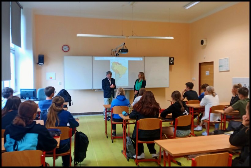 Ve středu 7. září navštívili naši školu dva učitelé Ricardo Veira a Alejandra Lesik z argentinské školy Gutenberg v Misiones. Třídě 4.E představili školu, město Misiones a projekt cest se žáky do Evropy. Zajímavostí je, že je to jediná střední škola v Argentině, která cestuje do Evropy a že v této oblasti žije již třetí generace českých přistěhovalců. Následně si prohlédli školu a historický střed města a probrala se možná spolupráce mezi našimi gymnázii.