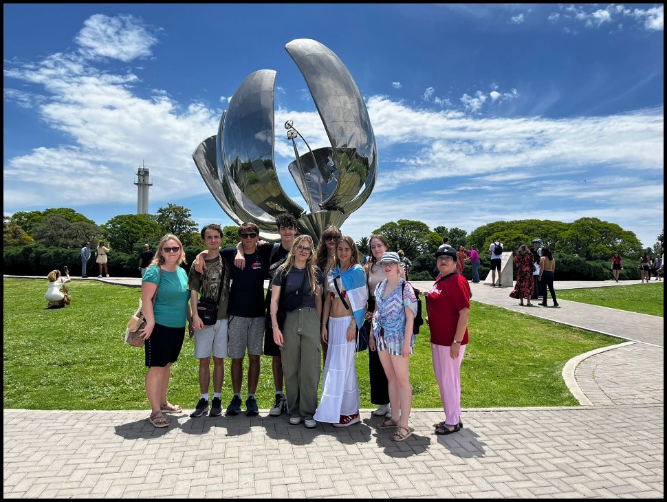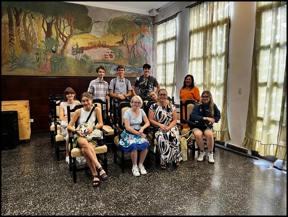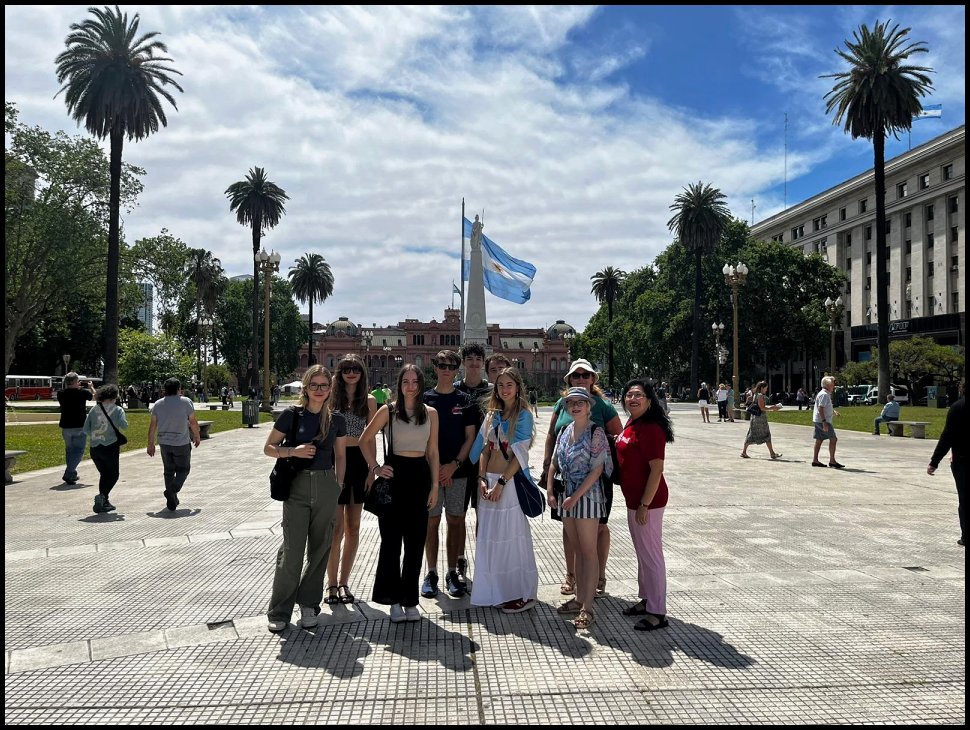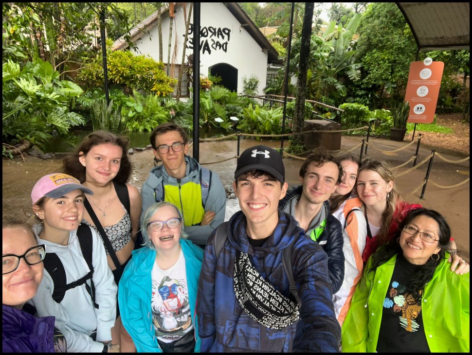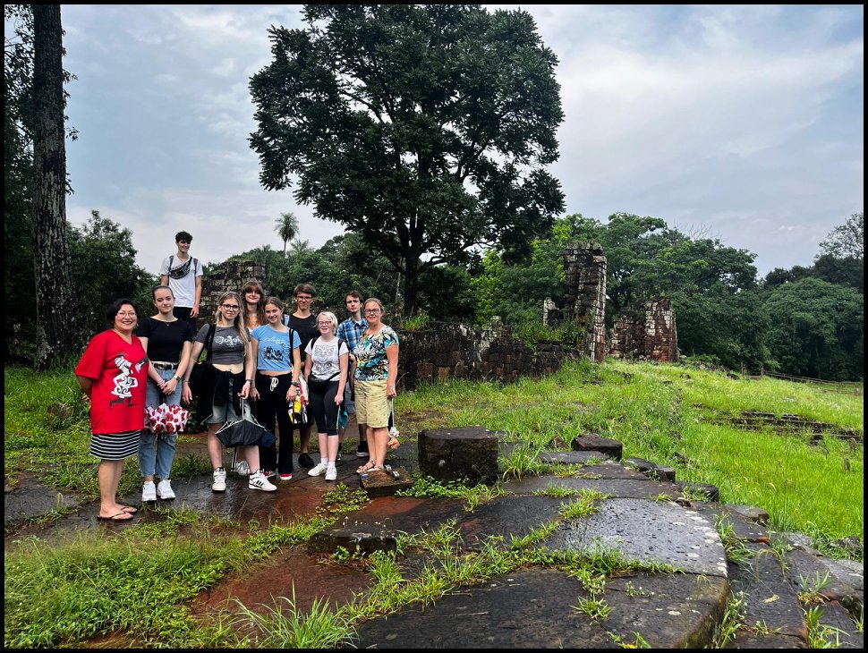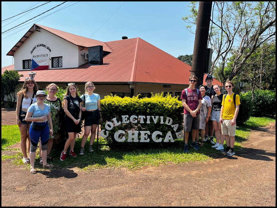 Dne 6. listopadu 2023 se naše desetičlenná skupina vydala na nezapomenutelný dvoutýdenní výlet do Brazílie a Argentiny. Naší první destinací byla Brazílie, kde jsme za deštivého dne obdivovali jeden z divů světa, vodopády Iguazú. I přes nepřízeň počasí to byl nádherný zážitek, který nám otevřel okno do místní dech beroucí fauny a flóry. Po krátkém, avšak intenzivním pobytu v Brazílii jsme přejeli do Foz de Iguazú v Argentině, kde jsme za horkého dne obdivovali vodopády z argentinské strany. Následně jsme zamířili do města Posadas v Misiones, kde nás srdečně přivítaly rodiny ze spřátelené školy Instituto Gutenberg. Společný víkend s rodinami nám umožnil nahlédnout do místní kultury, ať už při sdílení rodinných zážitků či návštěvě jejich školy. Pobyt v Posadas nás obohatil nejen o nové perspektivy, ale také prohloubil naše mezilidské vztahy a poskytl nám intenzivní trénink španělštiny. Ochutnali jsme místní tradiční speciality, navštívili plantáže čaje a populární bylinky mate, zajeli jsme se podívat na ruiny obydlí domorodých předků Guaraní a zavítali i do třetího státu našeho výletu, Paraguay.