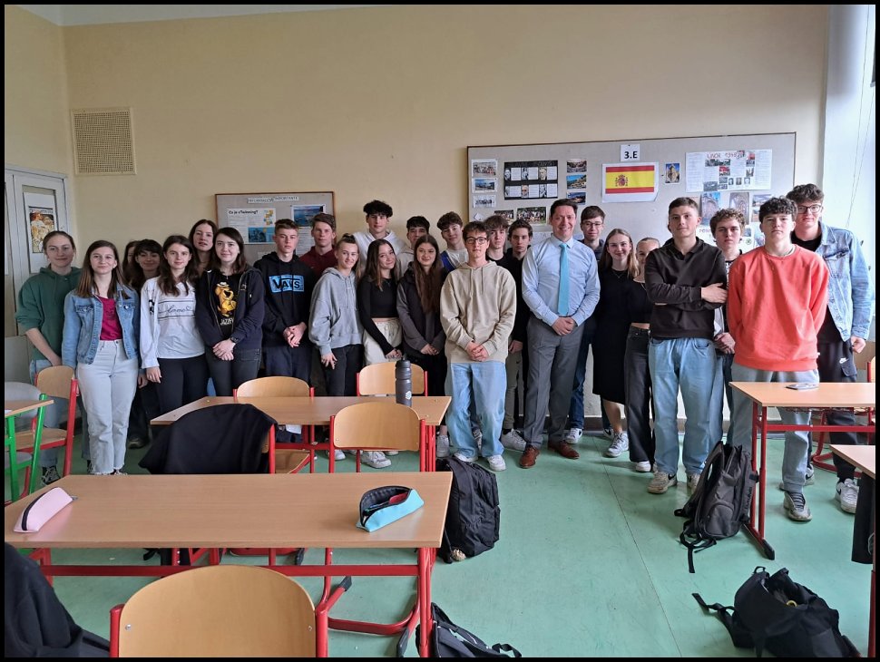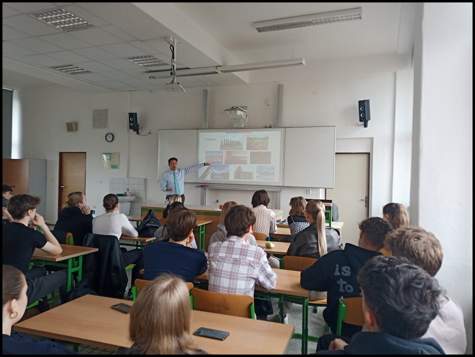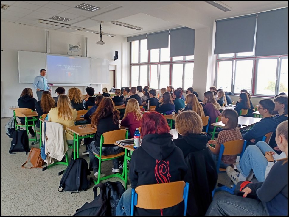 Dne 10. dubna si žáci tříd 3.E, 4.E a 5.E vyslechli poutavou prezentaci o Chile, přičemž přednášejícím byl ten nejpovolanější, a to konzul Carlos Gajardo působící na Velvyslanectví Chilské republiky v Praze. S barvitostí líčil dějiny, kulturu a zvyky této tak vzdálené, a přesto v mnoha ohledech nám podobné zemi. Velmi zajímavě nám byla předána i geografická fakta, díky čemuž jsme zjistili, že délka Chile od nejsevernějšího do nejjižnější bodu odpovídá cestě z Madridu až do Moskvy! Děkujeme panu konzulovi za jeho návštěvu a rádi jej znovu na našem gymnáziu přivítáme.