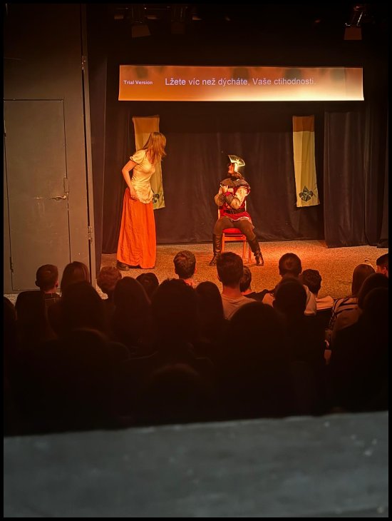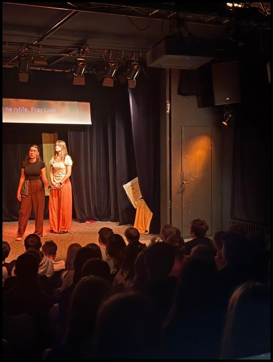 Dne 19. dubna jsme se vydali na divadelní představení v Dialogu, připravené španělskými učiteli Juanem a Laurou a odehrané výběrem žáků ze tříd 4.E a 5.E. Jednalo se o hru s názvem En medio del medievo, která je originální tvorbou již zmíněného Juana. Děj vypráví o intrikách španělského dvora, od podvodného rytíře, pseudodoktora a vykrmeného kněze, po osamocenou královnu a hrdinnou princeznu. Publikum, složeno ze všech tříd naší bilingvy, představení velmi ocenilo, starší třídy o to více, protože si mohly naplno vychutnat španělské slovní hříčky a četné vtipy. Jako bývalí účastníci španělského divadla jsme si velmi užili skvělé herecké výkony našich mladších spolužáků, jejich odhodlanost dovést své role na maximum a zároveň i recyklované rekvizity z minulého roku. Jak je vidět, divadlo je ve skvělých rukou a nemůžeme se dočkat budoucích představení.