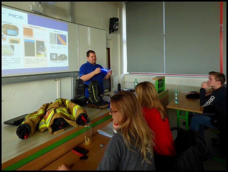 Ve středu 11. prosince 2019 měli žáci seminářů z fyziky možnost vyslechnout poutavou přednášku Ing. Jiřího Navrátila ze ZČU FEL v Plzni. Seznámili se s novými trendy v energetice, s výsledky vědeckého bádání i s vizí možného studia na FEL. Žáci věnovali pozornost ukázkám nových materiálů, elektrotechnickým součástkám a zaujala je hlavně „inteligentní“ bunda, rukavice a boty pro hasiče. Tyto praktické pomůcky jsou světovým unikátem, neboť jsou osazeny prvky vyvinutými právě na FEL a středisku RICE. V závěru přednášky pan Ing. Navrátil vyzdvihl kvality žáků gymnázia, neboť jsou pro studium na FEL dobře připraveni nejen z fyziky, ale i z matematiky, chemie a biologie.